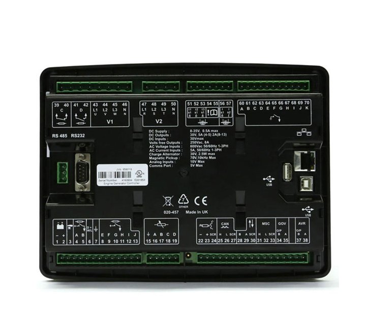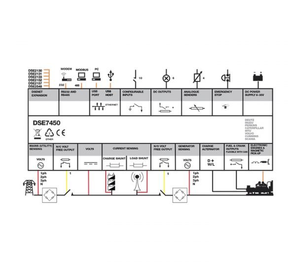 The DSE7450 is a control module designed to control DC/Hybrid generators in supplying both a load and/or the charging of batteries.