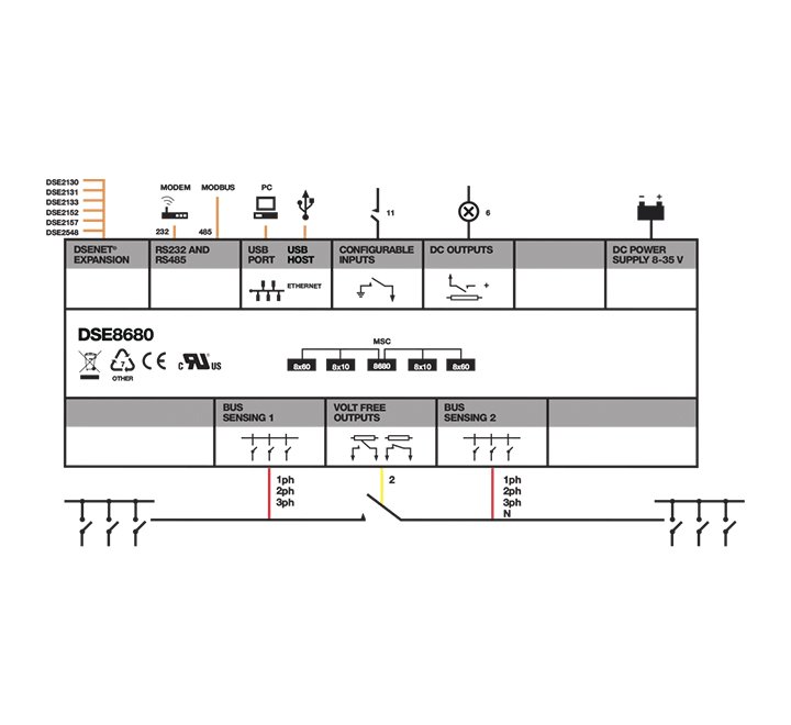 The DSE8680 is an intelligent control module designed to control a generator bus-tie breaker. The control module features technology that automatically manages the synchronising and check-sync across the breaker using the DSE multi-set communications (MSC) link when opening and closing the bus-tie breaker.